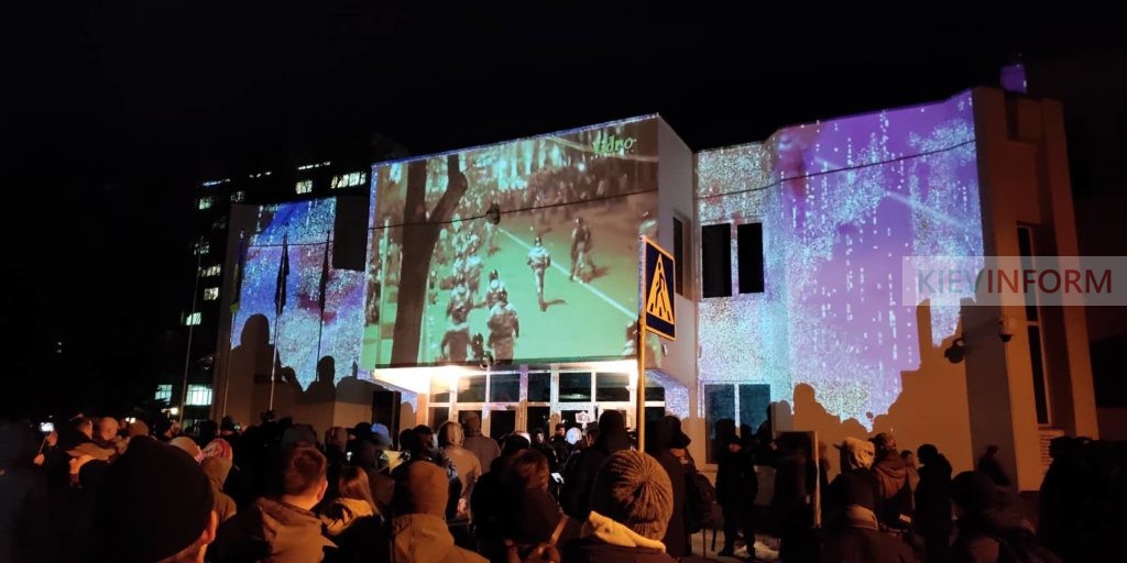 Люди запалили десятки фаєрів. На фасаді головного входу у комлпекс будівель МВС фільми про події, що відбувались 5 років тому.