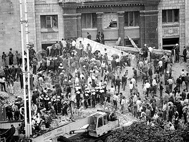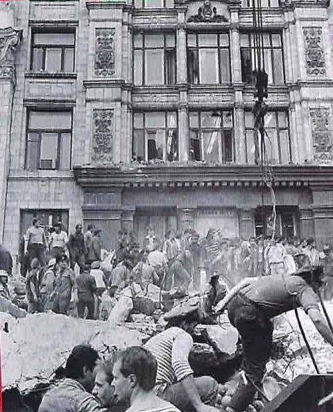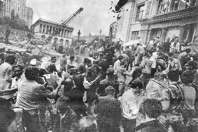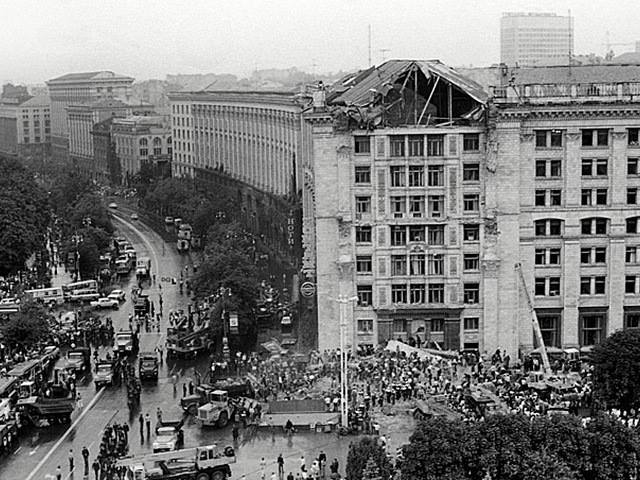О 16:20 Жовтнева площа та Хрещатик здригнулись від гучного шуму. Колони порталу будівлі та козирок обвалились, поховавши під собою усіх людей, що знаходились під ними. Загальна вага козирку складала 700 тонн. Під завалами опинились 13 людей.