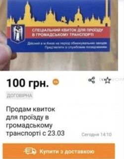Автор оголошення пропонує придбати спецпропуск для поїздок в громадському транспорті за 100 гривень. На даний момент оголошення вже видалено.